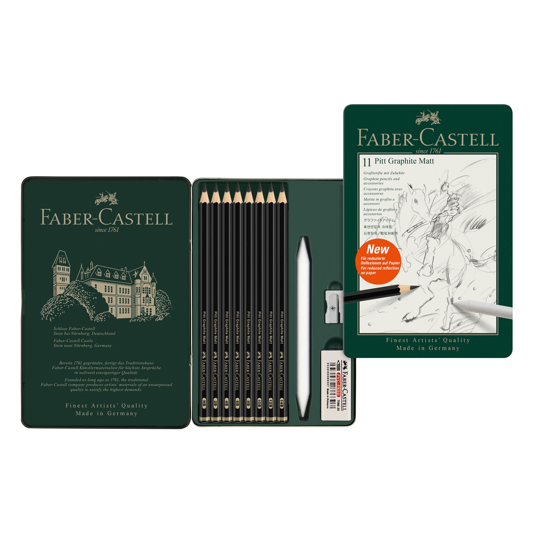 Faber-castell Pitt Graphite Matt Pencil 11pcs In A Flat Tin, Content: 8 Graphite Pencils Pitt Graphite Matt In Hb, 2b, 4b, 6b, 8b, 10b, 12b, 14b, 1 Blending Stump, 1 Eraser, 1 Single Metal Sharpener