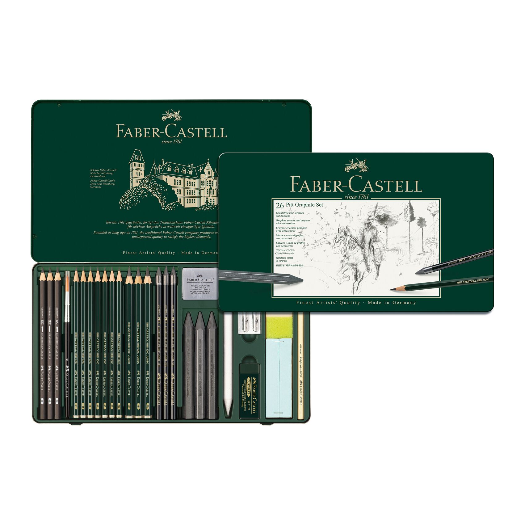Pitt Graphite set, tin of 19, Faber-Castell's Pitt Graphic range provides all creative artists with an extensive range of pencils and crayons in different grades of hardness for sketching, graphic design and shading work. The "green pencil from Faber", which was already being mentioned with approval by Van Gogh and Goethe, has now become part of everyday life. The 16 different grades of hardness range from a delicate grey hue to a deep graphite black, and offer artists a wide range of possibilities. The Pitt Graphite Pure leads are ideal for creating contrasts and shading extended areas. These pencils offer unparalleled possibilities for spontaneous expression, creating different effects based on the pressure applied and grade of hardness. The Pitt graphite crayons are an ideal and very economical medium for working on very large sketches and areas.