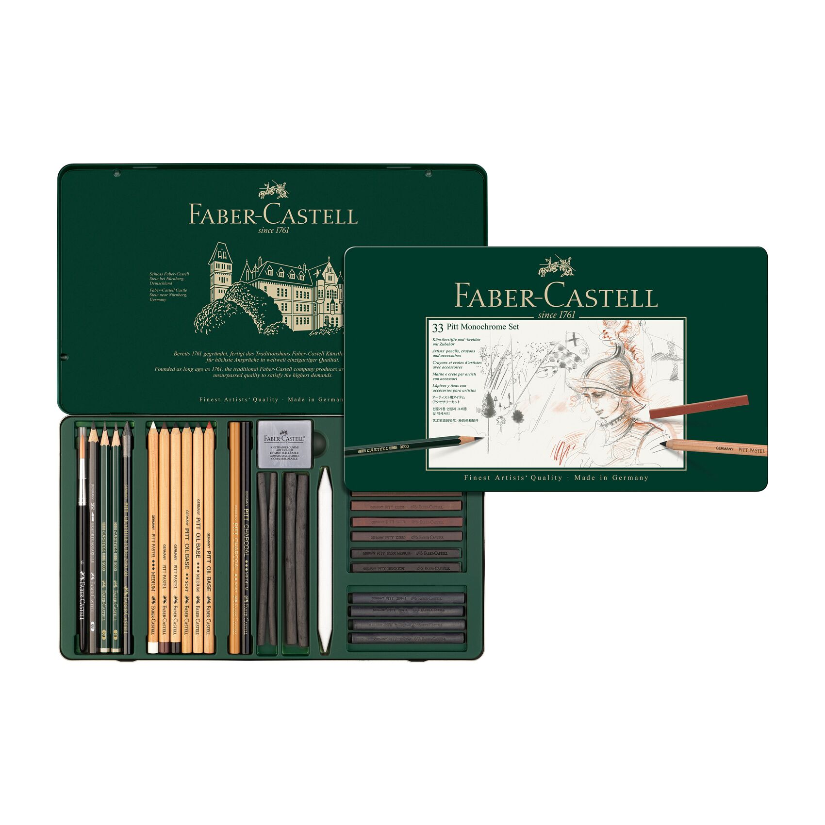 Faber-Castell Pitt Charcoal set, tin of 24,Natural charcoal sticks are the oldest sketching and drawing material in the world. The greyish-blue shade glides softly across the paper, rubs and smudges easily, and can be erased without difficulty and repeatedly overlaid. Their blueish hue has always held a fascination, even with the old masters. The charcoal pencils leave a much blacker line. Compressed charcoal with soot and clay give the charcoal pencils their deep black colour and can be produced in different degree of hardness.